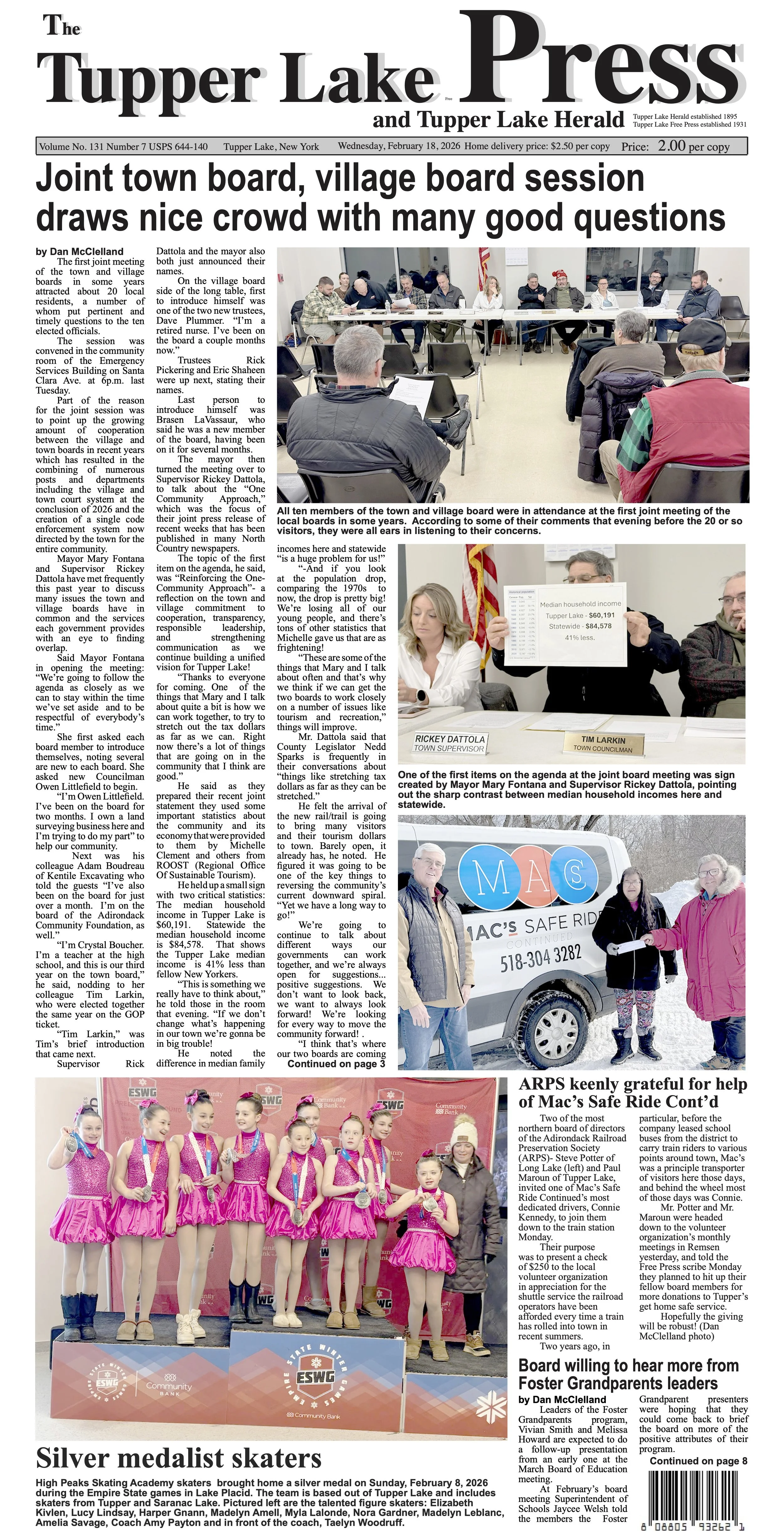 Featured News Feb 17, 2026 Silver medalist skaters Feb 17, 2026 Feb 17, 2026 Featured News: Feb 10, 2026 Bitter cold Saturday diminishes expected crowd at this year’s Northern Challenge Feb 10, 2026 Feb 10, 2026 Feb 3, 2026 Lions Club donates $10,000 to help rescue squad buy new ambulance this year Feb 3, 2026 Feb 3, 2026 Jan 27, 2026 “Olympus: The Greek Rock Musical” to be present by L.P. Quinn Theater Club next week Jan 27, 2026 Jan 27, 2026 Jan 20, 2026 Tupper Arts launches rehabilitation of Historic Adirondack State Theater Jan 20, 2026 Jan 20, 2026 Jan 13, 2026 Youth hockey players honored at Phil Edwards Memorial Jan 13, 2026 Jan 13, 2026 Obituaries: Featured Feb 17, 2026 Sylvie Niro, 62 Feb 17, 2026 Feb 17, 2026 Feb 17, 2026 Maria LoFurno, 90 Feb 17, 2026 Feb 17, 2026 Feb 10, 2026 Joel Counter, 41 Feb 10, 2026 Feb 10, 2026 Feb 3, 2026 Shirley J. Bailey, 83 Feb 3, 2026 Feb 3, 2026 Feb 3, 2026 Cynthia Facteau, 67 Feb 3, 2026 Feb 3, 2026 Feb 3, 2026 Glen Theriault, 71 Feb 3, 2026 Feb 3, 2026 Feb 3, 2026 Alice Baker Feb 3, 2026 Feb 3, 2026 Sign up for our digital subscription Login Local News Feb 17, 2026 Board willing to hear more from Foster Grandparents leader Feb 17, 2026 Feb 17, 2026 Feb 10, 2026 Blood Drive Thursday (February 12) Feb 10, 2026 Feb 10, 2026 Jan 13, 2026 Reunion committee looking for 1976 classmates Jan 13, 2026 Jan 13, 2026 Dec 16, 2025 Town board sets dates of two special meetings Dec 16, 2025 Dec 16, 2025 Dec 9, 2025 Castle of Toys pick-up and delivery December 20 Dec 9, 2025 Dec 9, 2025 Dec 2, 2025 Tupper Lake Community Red Cross Blood Drive Thursday, December 11 Dec 2, 2025 Dec 2, 2025 Nov 25, 2025 Hey kids: Lunch with Santa is Saturday Nov 25, 2025 Nov 25, 2025 Nov 18, 2025 Turkey Trot returning on Thanksgiving morning Nov 18, 2025 Nov 18, 2025 Nov 11, 2025 No surprises in Piercefield election Nov 11, 2025 Nov 11, 2025 Nov 4, 2025 Food pantry here, Tupper Lake community step up in SNAP crisis Nov 4, 2025 Nov 4, 2025 Oct 28, 2025 Trick or Treat on Park Street Friday Oct 28, 2025 Oct 28, 2025 Local News: