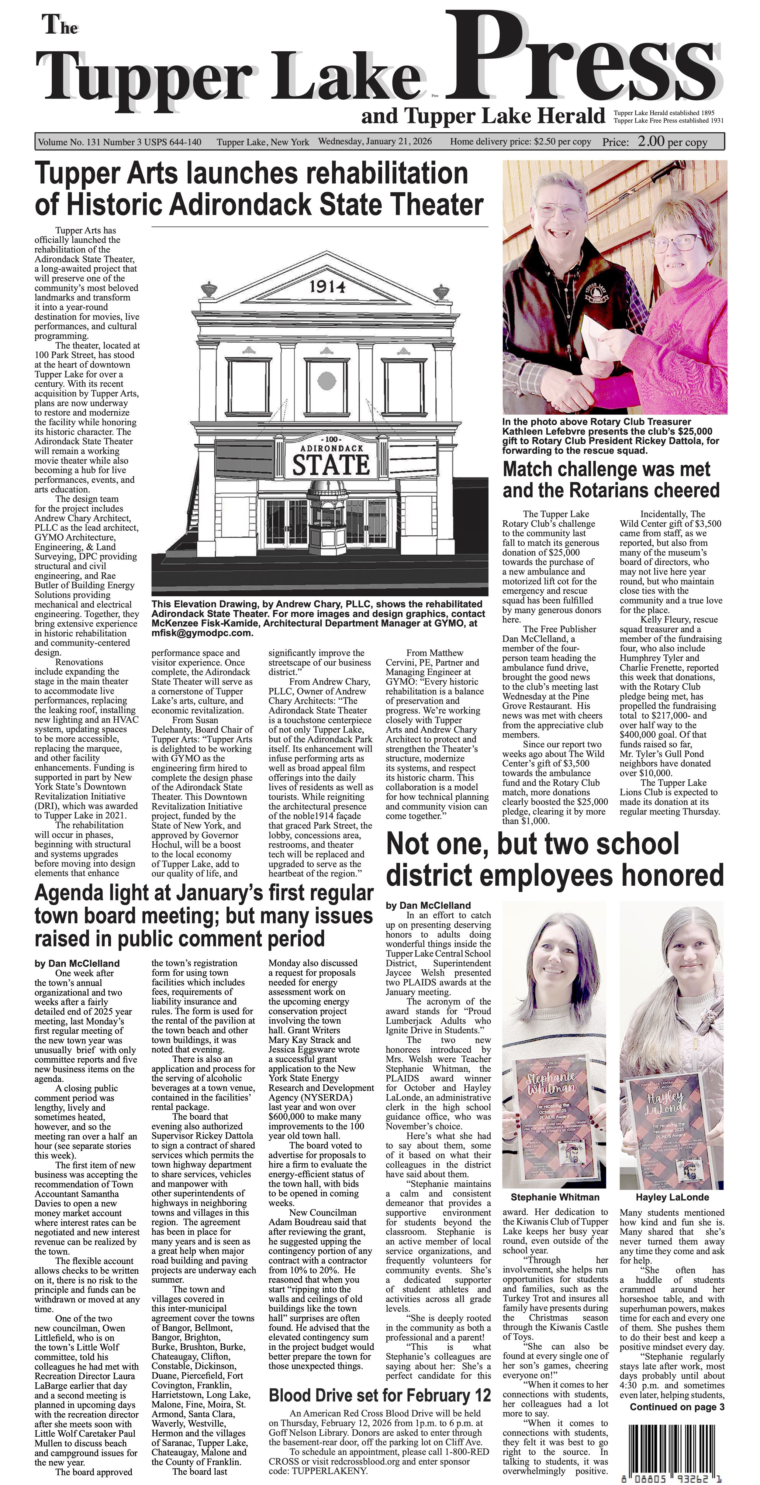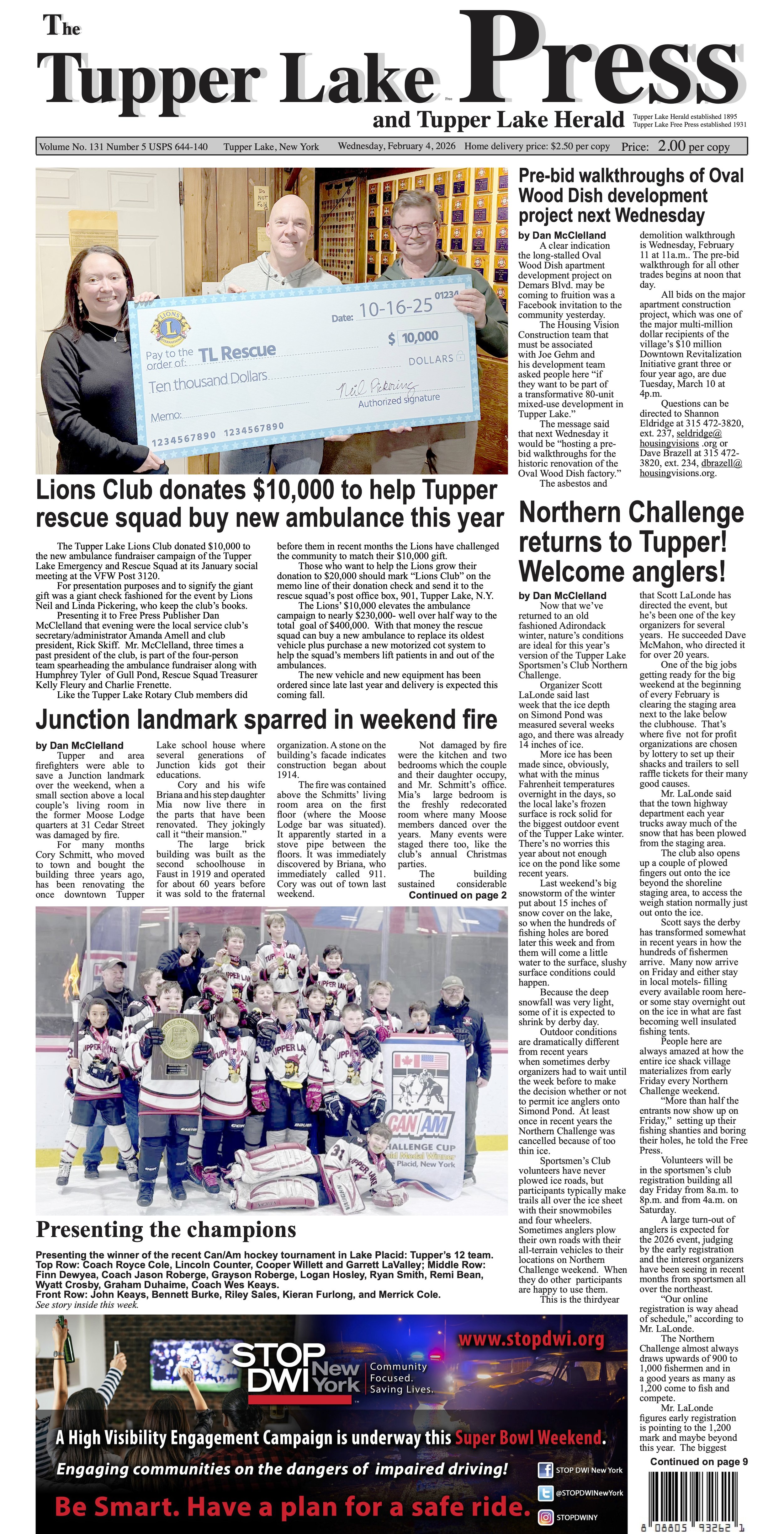 Featured News Feb 3, 2026 Lions Club donates $10,000 to help rescue squad buy new ambulance this year Feb 3, 2026 Feb 3, 2026 Featured News: Jan 27, 2026 “Olympus: The Greek Rock Musical” to be present by L.P. Quinn Theater Club next week Jan 27, 2026 Jan 27, 2026 Jan 20, 2026 Tupper Arts launches rehabilitation of Historic Adirondack State Theater Jan 20, 2026 Jan 20, 2026 Jan 13, 2026 Youth hockey players honored at Phil Edwards Memorial Jan 13, 2026 Jan 13, 2026 Jan 6, 2026 Presenting the new town board Jan 6, 2026 Jan 6, 2026 Dec 29, 2025 The Wild Center celebrates opening of Albany International Airport’s new Adirondack-Inspired play area and multi-sensory room Dec 29, 2025 Dec 29, 2025 Obituaries: Featured Feb 3, 2026 Shirley J. Bailey, 83 Feb 3, 2026 Feb 3, 2026 Feb 3, 2026 Cynthia Facteau, 67 Feb 3, 2026 Feb 3, 2026 Feb 3, 2026 Glen Theriault, 71 Feb 3, 2026 Feb 3, 2026 Feb 3, 2026 Alice Baker Feb 3, 2026 Feb 3, 2026 Jan 27, 2026 John Davis Jan 27, 2026 Jan 27, 2026 Jan 27, 2026 Richard “Dick” Dougherty, 74 Jan 27, 2026 Jan 27, 2026 Jan 20, 2026 Robert Leonard Belleville, 87 Jan 20, 2026 Jan 20, 2026 Sign up for our digital subscription Login Local News Jan 13, 2026 Reunion committee looking for 1976 classmates Jan 13, 2026 Jan 13, 2026 Dec 16, 2025 Town board sets dates of two special meetings Dec 16, 2025 Dec 16, 2025 Dec 9, 2025 Castle of Toys pick-up and delivery December 20 Dec 9, 2025 Dec 9, 2025 Dec 2, 2025 Tupper Lake Community Red Cross Blood Drive Thursday, December 11 Dec 2, 2025 Dec 2, 2025 Nov 25, 2025 Hey kids: Lunch with Santa is Saturday Nov 25, 2025 Nov 25, 2025 Nov 18, 2025 Turkey Trot returning on Thanksgiving morning Nov 18, 2025 Nov 18, 2025 Nov 11, 2025 No surprises in Piercefield election Nov 11, 2025 Nov 11, 2025 Nov 4, 2025 Food pantry here, Tupper Lake community step up in SNAP crisis Nov 4, 2025 Nov 4, 2025 Oct 28, 2025 Trick or Treat on Park Street Friday Oct 28, 2025 Oct 28, 2025 Oct 21, 2025 School board makes numerous appointments, hirings this month Oct 21, 2025 Oct 21, 2025 Oct 14, 2025 Fire destroys Cedar St.home Sunday Oct 14, 2025 Oct 14, 2025 Local News: