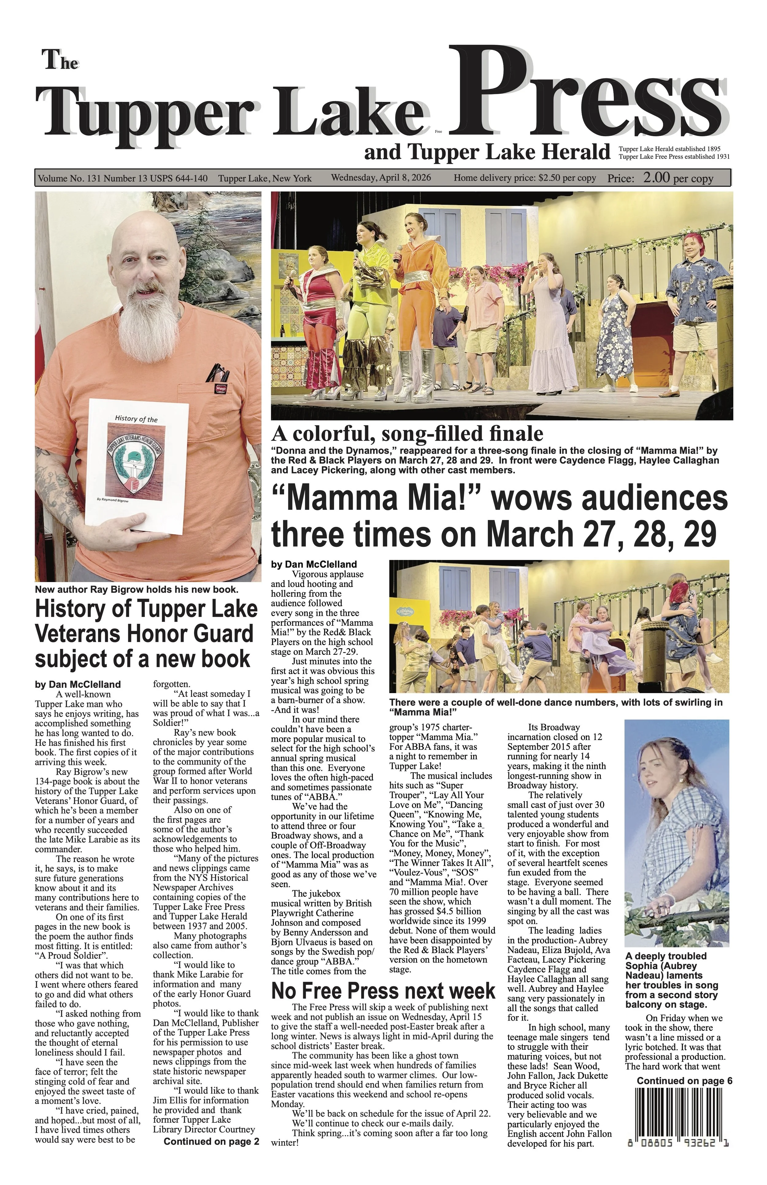 Featured News Apr 7, 2026 “Mamma Mia!” wows audiences three times in late March Apr 7, 2026 Apr 7, 2026 Featured News: Mar 31, 2026 Support for O.W.D. apartment complex PILOT strong at public hearing Tuesday Mar 31, 2026 Mar 31, 2026 Mar 24, 2026 Red & Black Players to present their own high-energy take on ABBA-hit-filled musical “Mamma Mia!” on March 27-29 Mar 24, 2026 Mar 24, 2026 Mar 3, 2026 Brewski again brings thousands to town Mar 3, 2026 Mar 3, 2026 Feb 17, 2026 Silver medalist skaters Feb 17, 2026 Feb 17, 2026 Feb 10, 2026 Bitter cold Saturday diminishes expected crowd at this year’s Northern Challenge Feb 10, 2026 Feb 10, 2026 Obituaries: Featured Mar 31, 2026 Patrick “Pat” Bentley, 83 Mar 31, 2026 Mar 31, 2026 Mar 24, 2026 Kyle Mathew Quesnel, 36 Mar 24, 2026 Mar 24, 2026 Mar 17, 2026 Richard Seafuse, 79 Mar 17, 2026 Mar 17, 2026 Mar 17, 2026 Burial notice: Bette Lou Varden Mar 17, 2026 Mar 17, 2026 Mar 10, 2026 Wilfred John Lanthier Mar 10, 2026 Mar 10, 2026 Mar 10, 2026 Robert “Bob” Christy Mar 10, 2026 Mar 10, 2026 Mar 10, 2026 Jeffrey Edward Madore, 56 Mar 10, 2026 Mar 10, 2026 Sign up for our digital subscription Login Local News Apr 7, 2026 Free Press won’t publish April 15 Apr 7, 2026 Apr 7, 2026 Mar 17, 2026 Billy Martin’s Cole All-Star Circus at high school Friday evening Mar 17, 2026 Mar 17, 2026 Mar 3, 2026 “Science on Tap” set for Thursday (March 5) Mar 3, 2026 Mar 3, 2026 Feb 17, 2026 Board willing to hear more from Foster Grandparents leader Feb 17, 2026 Feb 17, 2026 Feb 10, 2026 Blood Drive Thursday (February 12) Feb 10, 2026 Feb 10, 2026 Jan 13, 2026 Reunion committee looking for 1976 classmates Jan 13, 2026 Jan 13, 2026 Dec 16, 2025 Town board sets dates of two special meetings Dec 16, 2025 Dec 16, 2025 Dec 9, 2025 Castle of Toys pick-up and delivery December 20 Dec 9, 2025 Dec 9, 2025 Dec 2, 2025 Tupper Lake Community Red Cross Blood Drive Thursday, December 11 Dec 2, 2025 Dec 2, 2025 Nov 25, 2025 Hey kids: Lunch with Santa is Saturday Nov 25, 2025 Nov 25, 2025 Nov 18, 2025 Turkey Trot returning on Thanksgiving morning Nov 18, 2025 Nov 18, 2025 Local News: